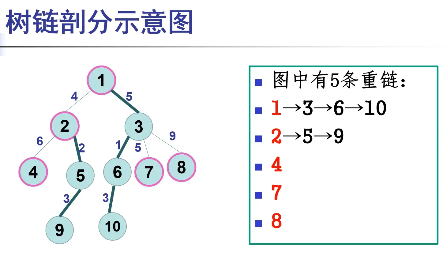 重链:重边连起来形成的链。每个点恰好属于一条重链。