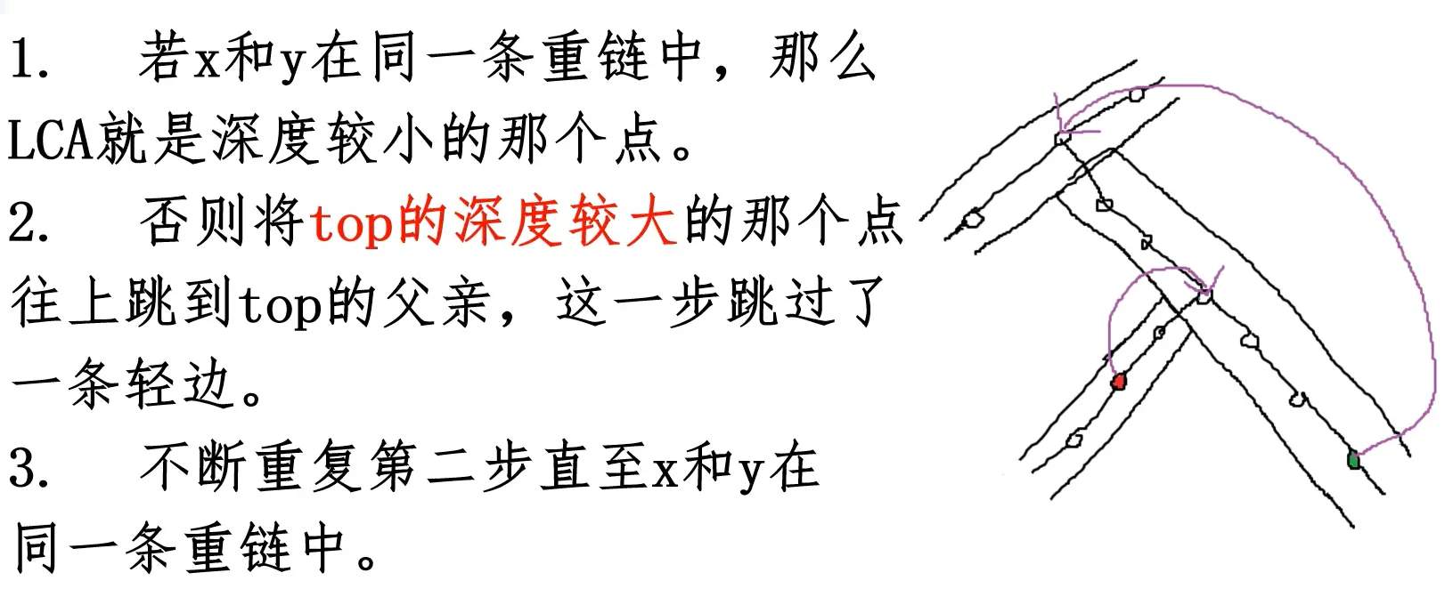 - 预处理出top[x]表示x所在重链的顶端。