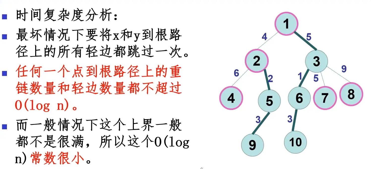 - 每次经过一条轻边size至少除以2,所以最多经过 \(O(\log\ n)\) 条轻边。