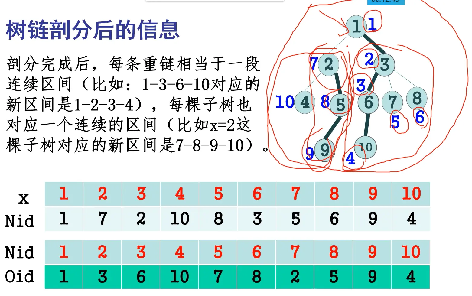 - 将依次DFS到的点记录下来,则每条重链是一个连续区间,每个点的子树也是一个连续区间;