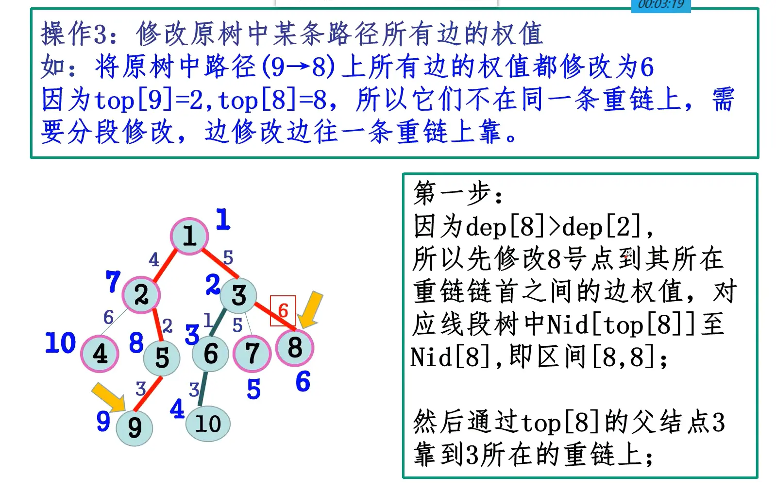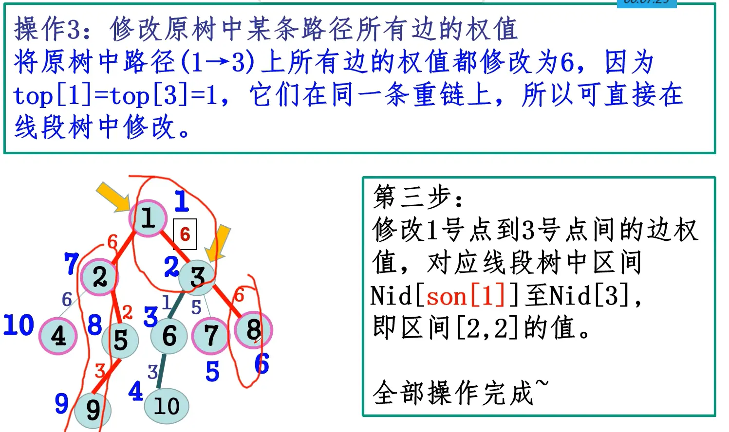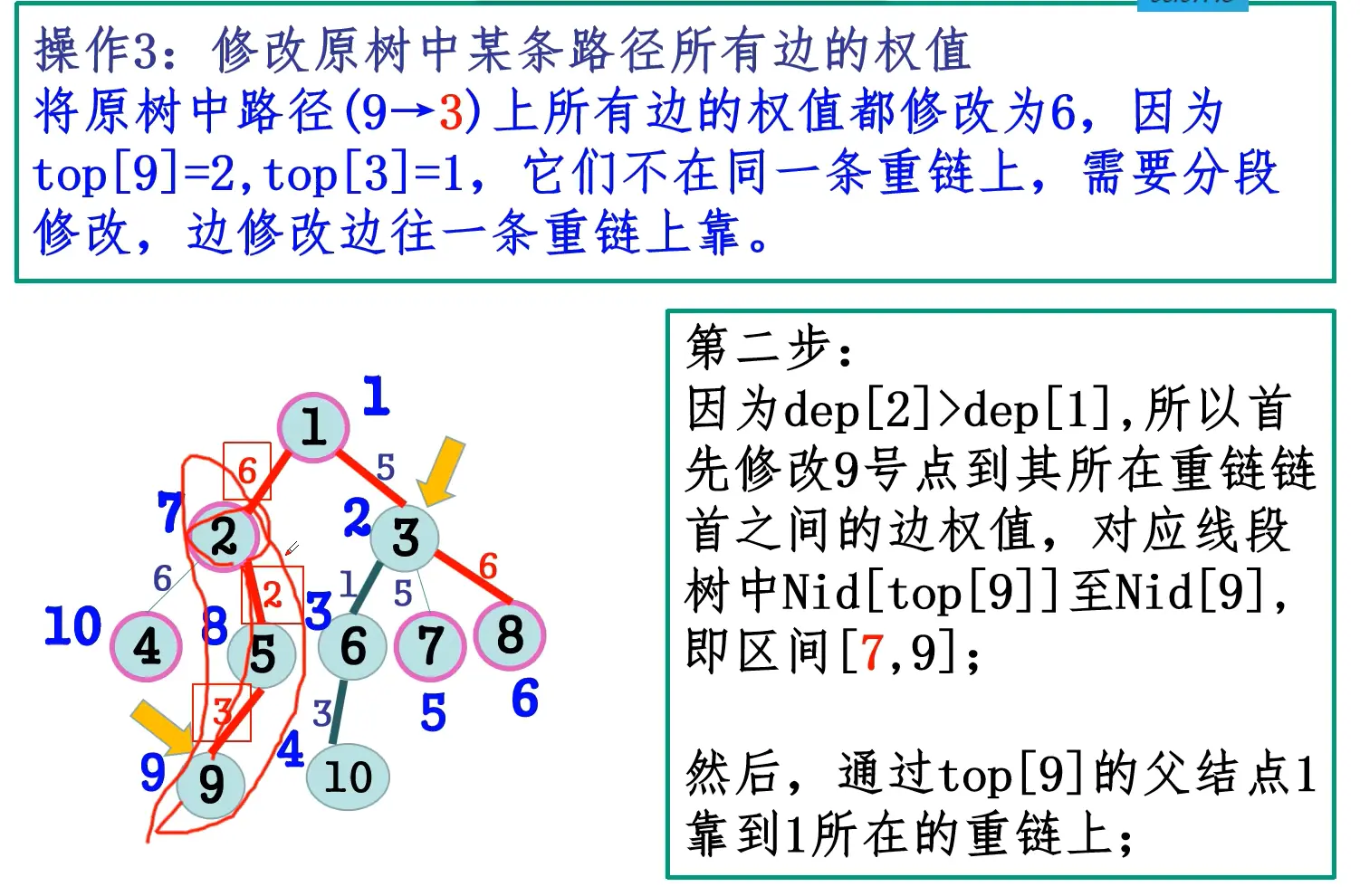 - 第二遍DFS确定每个节点x的top[x],特别指出:x和x的重儿子的top相同。