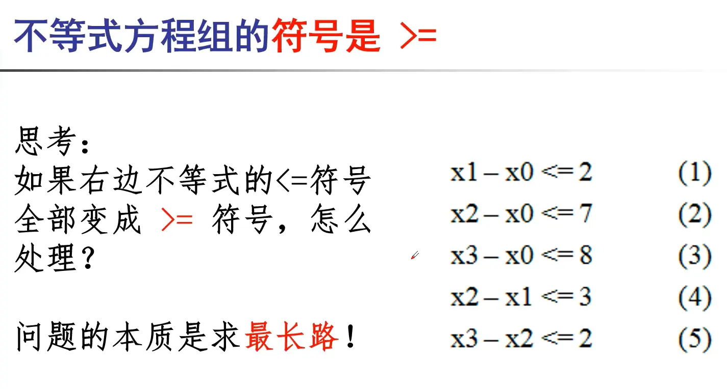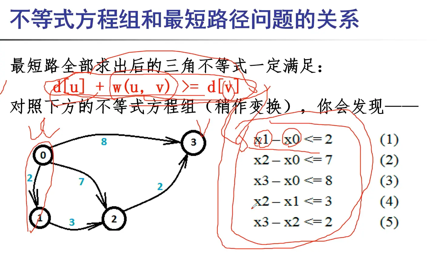 - 如果一个系统由n个变量和m个不等式组成,并且这m个不等式均为\(X_i - X_j \leq a[k]\)的形式,这样的系统称为差分约束(difference constraints)系统。